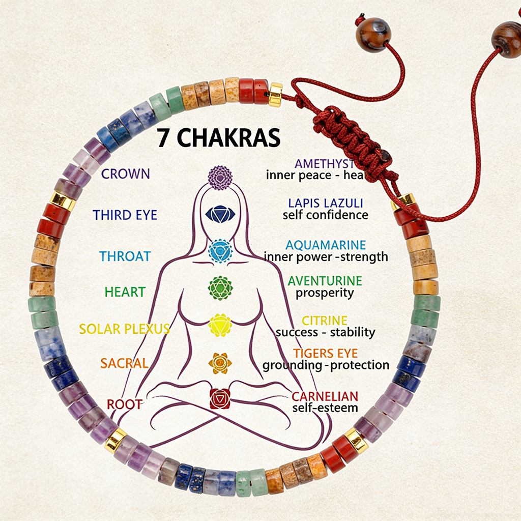 Natural crystal beads are strung to align with the seven major chakras, balancing the body’s energy field.